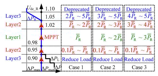 In Figure 12, the first layer |ΔUdc| ≤ 0.02, corresponds to the network-free mode, the second layer 0.02 <| ΔUdc | ≤ 0.05 corresponds to the network current limiting mode, and the third layer 0.05 <| ΔUdc | ≤ 0.1 corresponds to the current limiting or islanding mode. The first layer bus voltage | ΔUdc | ≤ 0.02 corresponds to the microgrid-free mode. As the permanent magnet synchronous motor (PMSG) runs in maximum power point tracking (MPPT) mode, the grid inverter is used to stabilize the DC bus voltage. The energy storage unit is SOC-preconditioned and is ready to stabilize the DC link voltage in the second layer. After the power expended from the interaction between the large grid and the microgrid has reached a maximum and the bus voltage exceeds the range of layer 1, it enters layer 2 or 3. This can also occur if the output power of the PMSG or load suddenly changes.