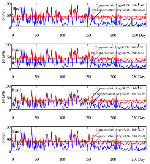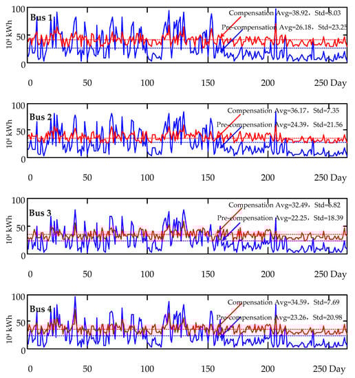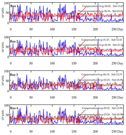 If the wind power output is higher than the average power, the energy storage unit is charged; when the wind power output is lower than the average power, the energy storage unit is discharged. A comparison of the simulation results is shown in Figure 14. After the compensation, the standard deviations of the four buses are 13.67 × 104 kWh, 12.52 × 104 kWh, 12.75 × 104 kWh, and 12.99 × 104 kWh, which are 9.58 × 104 kWh, 9.04 × 104 kWh, 5.64 × 104 kWh, and 7.99 × 104 kWh, respectively, before the compensation. The average outputs after compensation are 38.92 × 104 kWh, 31.47 × 104 kWh, 26.19 × 104 kWh, and 29.32 × 104 kWh, up 12.74 × 104 kWh, 7.08 × 104 kWh, 3.94 × 104 kWh, and 6.06 × 104 kWh, respectively, before compensation.