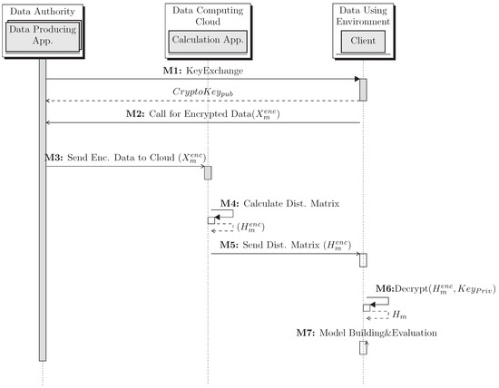 The pseudocode for the Client Computation phase of the proposed system is shown in Algorithm 1. In lines 2–3, the client creates public/private crypto keys, keeps the private key internally, and sends the public key to the cloud service provider. In lines 4–5, the client encrypts the training dataset and sends it to the cloud service provider. At this stage, the cloud service provider has access to the public key and to the data to perform the calculation. In lines 6–7, the cloud server performs distance calculations on the encrypted data using the metric information given as parameters. It sends the encrypted distance matrix back to the client.