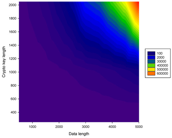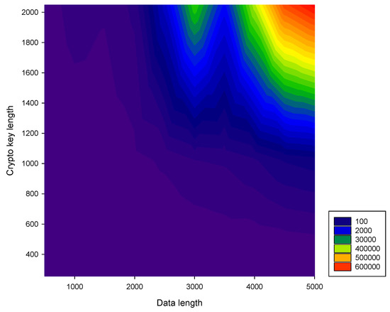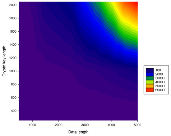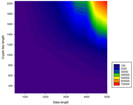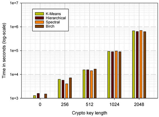 Based on the results presented in Section 5.2 and the computation results shown in Table 2, Table 3, Table 4 and Table 5, we conclude that 2048 bit crypto key is the approach that provides the best results for all evaluation metrics. When it comes to the execution time of proposed training model it is clearly evident from the figures that this approach is not efficient enough. Even though we have achieved the best results in the clustering model performance with a crypto key with a 2048 bit length, it seems that the training time takes quite a long time. The training phase of the 2048 bit length crypto key is about eight times more of the training with the 1024 bit length crypto key. Security standards state that it is necessary to use crypto keys with a minimum length of 2048 bits in order to ensure privacy [27]. Although the 2048 bit key length is required by security standards, we also shared the results of other key lengths in this study. Figure 7 shows the duration of the clustering algorithm’s training phase with a 5000 row dataset when using crypto keys from 256, 512, 1024, and 2048 bit lengths.