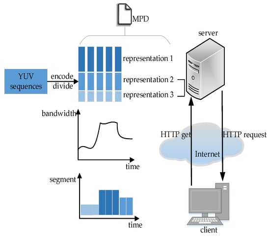 Recently DASH (dynamic adaptation streaming over HTTP (i.e., HyperText Transfer Protocol))-based technology has been widely adopted to deliver video content over the Internet since it is able to automatically match video quality with the available network bandwidth for proper accessibility and delivery []. Based on DASH system architecture as shown in Figure 1, the video on the server side is divided into small segments with different representation levels, all of which are described in an MPD (media presentation description) file []. When a video streaming session starts, the server sends the MPD file to the client to offer access to the segments, and the client sends an HTTP-get message to request the segment with a bitrate closest to the available network bandwidth. This way users receive a video streaming service with a much more satisfying QoE (quality of experience).