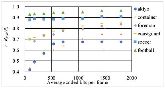 All the classic video sequences used in this paper are from the website (i.e., http://trace.kom.aau.dk/yuv). According to Equations (1) and (2) above, we get the GOP-related ratio r of the sequences Akiyo, Container, Foreman, Coastguard, Soccer, and Football with different average bits/frame and draw the scatter plot as shown in Figure 2.