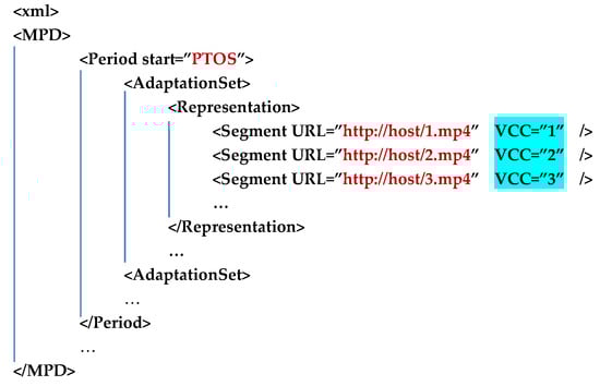 MPEG-DASH is an open standard that allows the extension of MPD file for adding components of the media content as needed. In each segment, we add a VCC attribute functioning as its video content complexity tag for the convenience of the client to differentiate segments with different content complexities, as shown in Figure 3. When the video streaming session starts, the MPD file is downloaded to the client, and the corresponding VCC attributes are parsed out as an input parameter for the decision of the media representation.