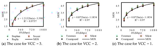 In Figure 4, the MOS–bitrate curves under different VCC are fitted according to the nearest neighbor principle. In Equation (3), the fitting parameters and are shown in Table 3.