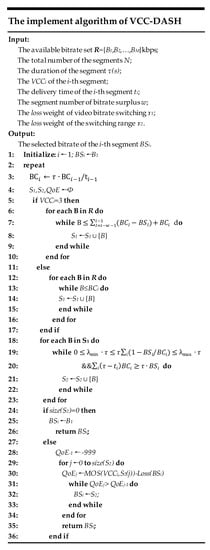 Here we present the implement of the proposed strategy VCC-DASH, as shown in the following textbox of Figure 5. The bitrate of the first segment is initialized as the minimum bitrate in the available bitrate set . VCC-DASH selects bitrate for each segment. Lines (5–17) get the available bitrate set under the constraints of Equation (6). Lines (18–23) shows the joint constrains of Equations (7) and (8) on the bitrate selection. If there is no available bitrate, VCC-DASH directly assigns the lowest bitrate to the segment as shown in lines (24–27). Otherwise, the segment with the maximized QoE is selected as shown in lines (28–36). This is assuming that there are N segments of the video and the number of bitrate representations in the available bitrate set is M. As usual, M is much smaller than N. When the network bandwidth is so stable and sufficient that the biggest bitrate in is available, the VCC-DASH has to traverse the available bitrate set to calculate the QoE for each segment according to the optimization model, and then select the segment with the optimal QoE. In this case, the time complexity is , which means that the proposed VCC-DASH is fast enough for practical deployment.
