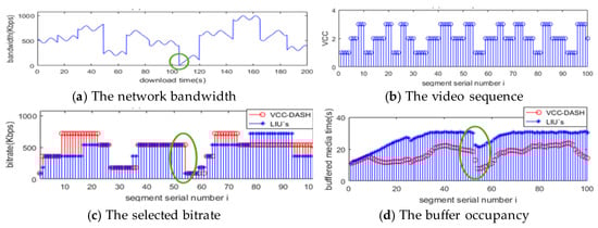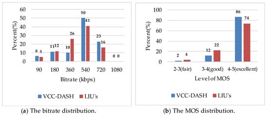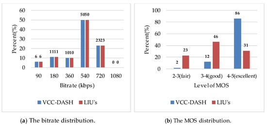 Moreover, the distribution of MOS is shown in Figure 7b, and the proportion of subjective opinion “excellent” is as high as 86% in VCC-DASH, which is significantly higher than that of LIU’s strategy. The advantage roots from that VCC-DASH collect bitrate surpluses of the prior segments and provide them to segments with high VCC so that the MOS of the segments with high VCC is visibly enhanced, and at the same time the QoE of the whole video is more equalized. In general, the proposed VCC-DASH can improve users’ QoE and offer an equalized viewing experience.