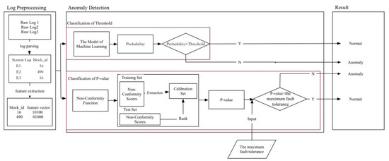 In order to facilitate the comparison, in addition to the proposed p-value classification method, the threshold classification method is also given for comparison. The framework of the model is shown in Figure 1. The first stage of the model is log preprocessing. The raw log is obtained by log parsing and feature extraction to acquire the matrix of feature vector. The second stage is anomaly detection. In the threshold-based classification method, the machine learning model is trained to perform anomaly detection on the test set and obtain the probability until the measured data are normal for judgment. In the p-value-based classification method, the algorithm is regarded as a non-conformity function to obtain non-conformity scores and calculate the p-value. The maximum fault is set tolerance to detect anomalies.