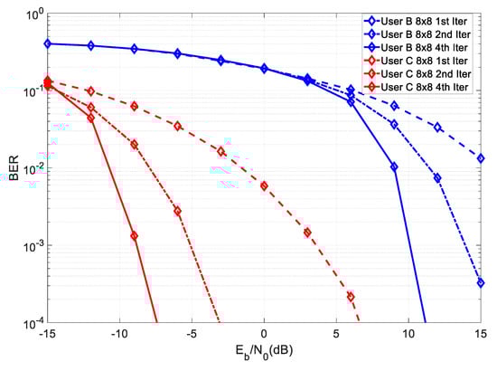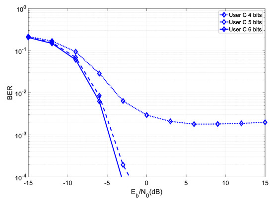 From the figure, it can be seen that User C required an SNR of about 18 dB lower than User B, in order to achieve the same BER in the first iteration, which corresponded to the gain due to the higher transmit power. As mentioned before, the partial key must be quantized using a finite resolution, before being transmitted. Figure 4 shows the achievable BER results for a system at User C for different quantization resolutions.