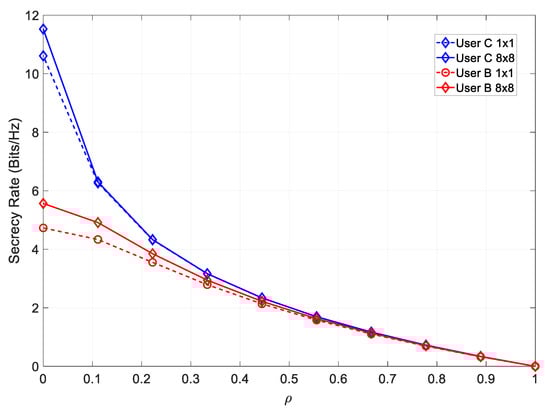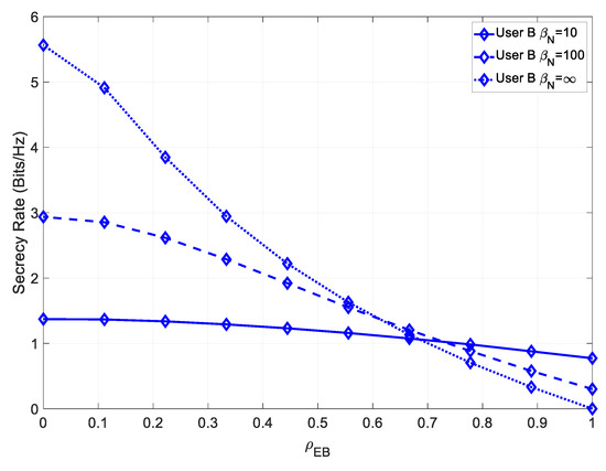 In this scenario, there was an LOS with all users; therefore, we analyzed the impact of the power ratio on the attainable secrecy rate. In Figure 8, the secrecy rate for various values of is shown for User B.