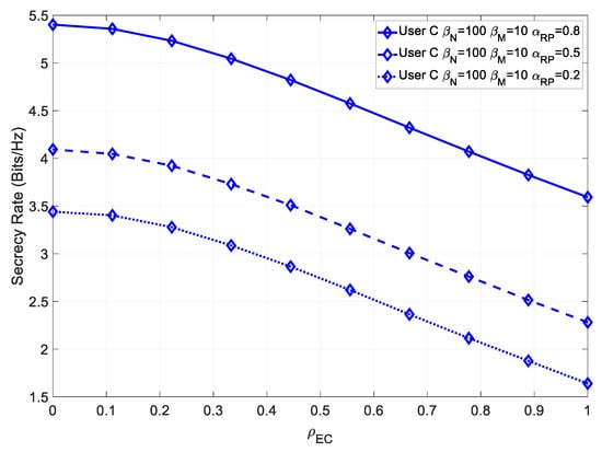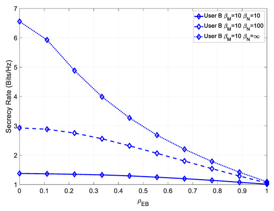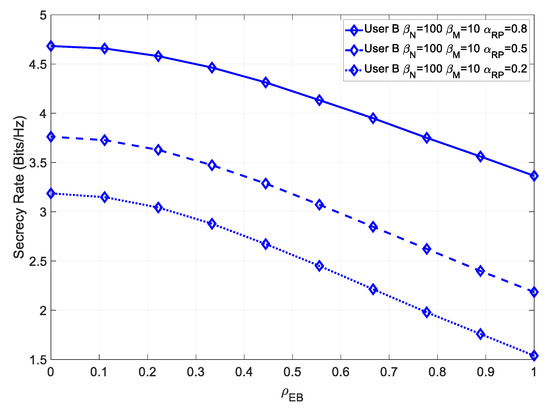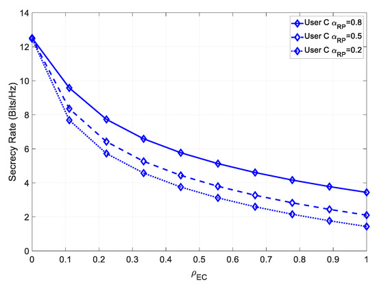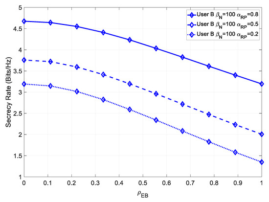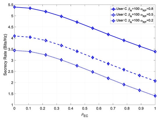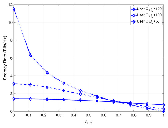 It could be seen that, similarly to User B, this system achieved a higher maximum secrecy rate, at low values of , and a higher secrecy rate, even for high values .