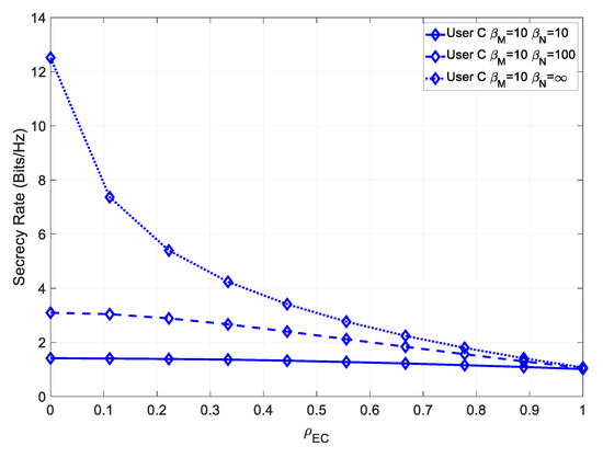Similarly, for a higher contribution of the multipath component, the achievable secrecy increased. Since in this case, there was perfect channel estimation, then User C achieved a much higher maximum secrecy rate than User B, due to its higher channel capacity. Figure 14 shows the secrecy rate for various values of , in the presence of channel estimation errors.