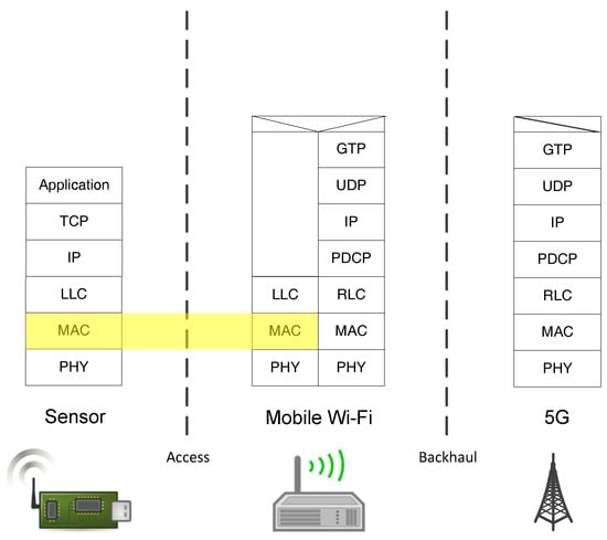 To establish a connection between the sensor nodes and mobile networks, such as a 5G network, a wireless access point known as a mobile Wi-Fi device is deployed. The mobile Wi-Fi device can be used to access 5G network services with the help of a SIM (Subscriber Identity Module). Hence, ehealthcare services could be offered even when the patient is not at home or in hospital. To provide outdoor monitoring services to patients, the use of a smartphone with a mobile hotspot could also be a very handy option as a Wi-Fi access point for CPS. An arrangement involving a mobile hotspot offers mobility support and also helps in achieving the high data rates tendered by the future mobile networking systems. The sensor nodes in the vicinity of the mobile hotspot capable of communication via Wi-Fi access point could avail the services of high-speed internet. Smartphones provide the feature of a mobile hotspot where an LTE-A access network is used to link the backhaul traffic to LTE-A broadband internet, whereas Wi-Fi services are provided to sensor nodes in the Wi-Fi coverage area. Such a smartphone or mobile Wi-Fi device comprises a Wi-Fi protocol stack towards the access link side and an LTE-A protocol stack towards the backhaul link side (Figure 2).
