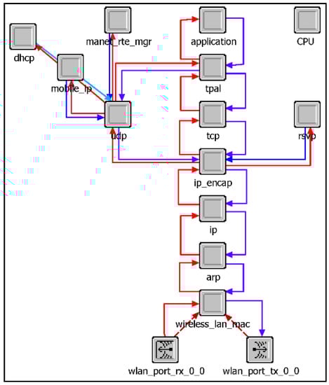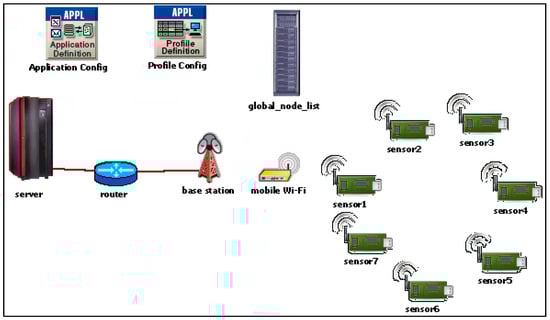 In this paper, the design, implementation and evaluation of a WBAN-based scheme for data traffic prioritization is achieved with the help an OPNET Modeler-based [25] simulation environment. The simulation model primarily consists of three domains, i.e., the Wi-Fi based access domain, the 5G based backhaul domain, and the 5G core network. The access domain consists of the mobile Wi-Fi device access protocol stack and sensor nodes deployed in the Wi-Fi coverage area. The backhaul domain consists of the mobile Wi-Fi and base station with their 5G air interface protocol stacks. The 5G core network consists of a 5G gateway labelled as a server in the simulation environment. The gateway node works as a sink for uplink data, and all the uplink packets originating from sensor nodes are destroyed here. The 5G gateway is connected to the 5G base station via router and Ethernet links, with 20ms as mean delay. All nodes consist of protocols such as Internet Protocol (IP) and User Datagram Protocol (UDP), along with Ethernet in the core network and wireless protocols in the access and backhaul domains. The protocols in the backhaul domain also include Radio Link Control (RLC), Medium Access Control (MAC) and Packet Data Convergence Protocol (PDCP). The information related to sensor nodes’ mobility and channels is kept in the form of a database at the node labeled ‘global_node_list,’ which is accessible from all the nodes in the simulation environment. All the node-related parameters are initialized in the ‘global_node_list’ at the start of each simulation run. The simulation environment and protocol stack for the sensor node are depicted in Figure 4 and Figure 5, respectively.