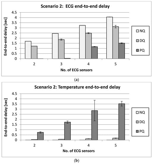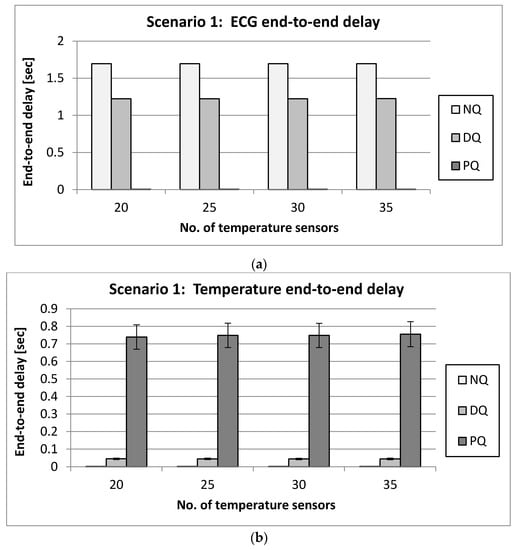 In the first scenario, the performance of the NQ, DQ and PQ schemes is compared in terms of average packet end-to-end delay and throughput. In Scenario 1, sensors’ deployment in the simulation environment is done in such a way that there are two ECG sensor nodes in each sub-scenario (Table 4). The number of temperature sensor nodes in the first sub-scenarios is 20. The number of nodes is increased stepwise in subsequent sub-scenarios by adding five additional nodes. Therefore, the number of temperature sensors in the four sub-scenarios can be given in the form of a sample space as {20, 25, 30, 35}. The average values of results obtained from simulation runs for each parameter are illustrated in the graphs along with the 95% confidence intervals, determined using ten seeds, shown as error bars. If an error bar is missing, this would imply that the confidence interval is almost zero in that specific case.