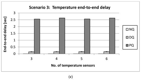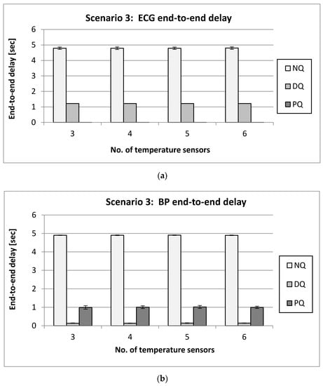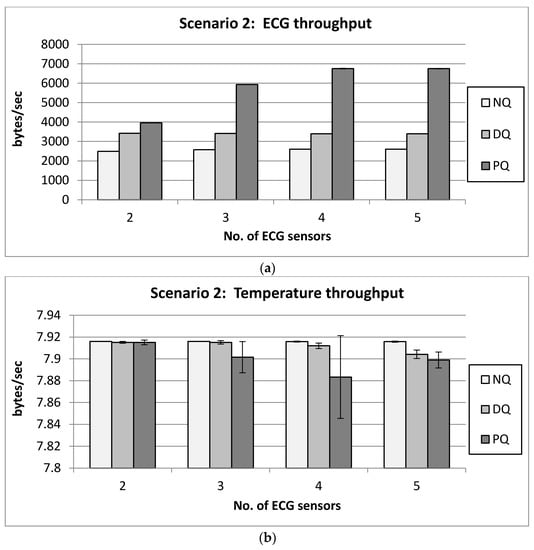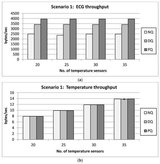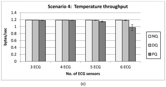 The results for ECG end-to-end delay show that, in the case of the PQ scheme, ECG data traffic is treated with high priority, hence small end-to-end delays, as compared to DQ and NQ schemes, are achieved. Temperature devices accomplish end-to-end delay results in such a way that, in the case of the PQ scheme, high end-to-end delays are noticed as compared to DQ and, eventually, NQ schemes. In Figure 7, it is seen that the PQ scheme achieves better throughput as compared to DQ and NQ schemes. The evident reason for this performance is the high priority scheduling that the PQ scheme renders to ECG nodes. Consequently, the transfer of large volumes of ECG data to the network with improved spectral efficiency can be accomplished, and the overall system performance in terms of cell throughput can be enhanced. In contrast, the mean temperature throughput stays unchanged for all three schemes in all sub-scenarios because of the higher ECG priority.