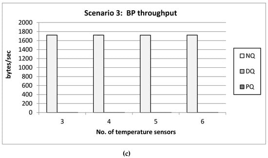 The three scheduling schemes are reevaluated for performance in terms of throughput and end-to-end delay. In this scenario, the results for BP traffic are also presented. Figure 10 and Figure 11 illustrate the results obtained in the third scenario. The results reveal that the performance of the PQ scheme is better than the other schemes when it comes to QoS differentiation. The proposed scheme provides low end-to-end packet delay results for ECG nodes, high end-to-end delay for BP nodes and even higher delays for temperature traffic nodes. Moreover, high throughput is noticed in the case of ECG sensors, low in the case of BP nodes and lowest in the case of temperature nodes.