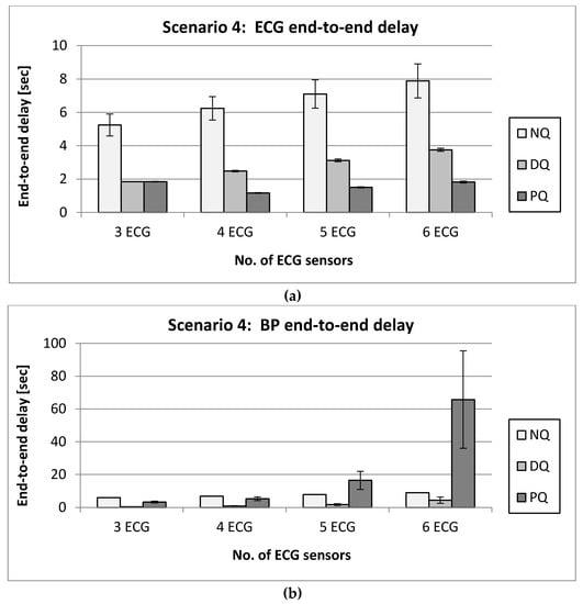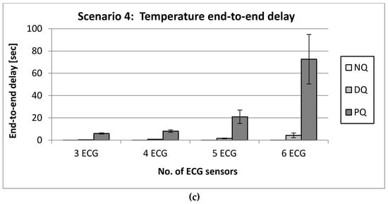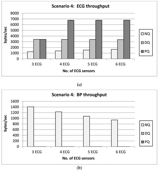Figure 12 describes end-to-end delay results obtained for all the sub-scenarios of the fourth scenario. The results illustrate that the PQ scheme performs better than DQ and NQ by accomplishing lower end-to-end delays for ECG nodes, then higher delays for BP devices and even higher delays for temperature devices. Moreover, improved ECG throughput is realized in comparison to ECG throughput achieved by other schemes, as illustrated in Figure 13. It is shown in these results that, in the case of the PQ scheme, ECG data traffic is transmitted with high-level priority, thus these nodes achieve low end-to-end delays when compared to DQ and NQ schemes, where end-to-end delays are larger. In the case of the PQ scheduler, the BP devices have greater end-to-end delays in comparison to the DQ scheme. The reason for this relatively poorer performance is that the scheme focuses on providing better services to ECG devices, while BP data traffic is considered more tolerant of delays. Delays of up to several minutes are acceptable in case of BP traffic. In case of temperature data traffic delays, the PQ scheme performs poorly as well, with higher delays noticed as compared to NQ and DQ schemes. However, even temperature delays of the order of minutes are considered to be acceptable and temperature data traffic is not as delay-sensitive as ECG. In throughput results, the PQ scheme accomplishes a high ECG throughput when compared to NQ and DQ schemes, as PQ provides higher transmission rates of data. In case of DQ and NQ schemes, data on transmission rates are low because PQ gives a high priority to ECG devices, and consequently succeeds in transferring more data of ECG sensors with enhanced spectral efficiency, resulting in an improvement in the cell throughput. In the case of the PQ and DQ scheduler, BP throughput becomes very low, due to the increase in ECG traffic, whereas temperature throughput when compared with ECG and BP devices is very low.