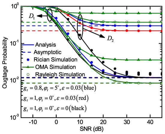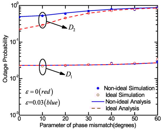 In Figure 4, we show the outage probabilities of and with ipSIC under the different levels of phase mismatch. The outage performances of and deteriorate with the increase of the value of phase mismatch. The greater the gap between the value of the phase mismatch and zero degrees, the greater the adverse effect of the phase mismatch on outage performance.