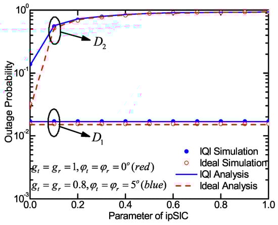Outage probability versus the parameter of ipSIC for the system with IQI and ideal conditions.