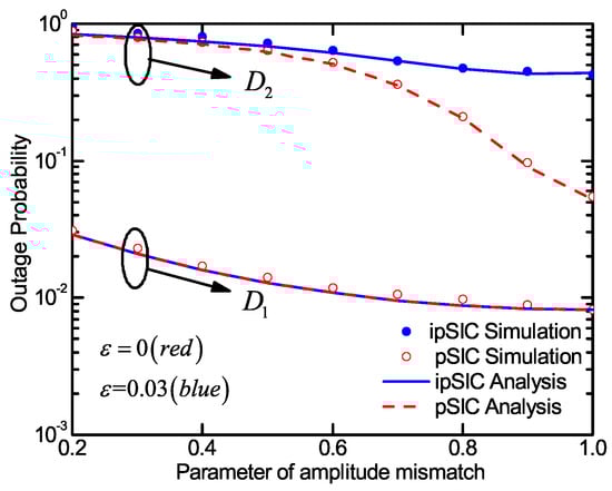 Figure 5 plots the outage probabilities of the two users with respect to the amplitude mismatch with ipSIC and pSIC conditions. It is clearly seen that the closer the amplitude mismatch parameter is to one, the better the outage performance of and becomes. The greater the gap between the value of the amplitude mismatch and one, the greater the harmful effect of the amplitude mismatch on system performance.