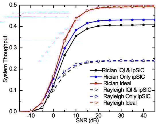 The effects of the three different conditions for the system throughput are evaluated in Figure 6, in which we fix the parameters of IQI as , and the ipSIC parameters as for the IQI and ipSIC conditions. For only the ipSIC condition, we fix the parameters of IQI as , and ipSIC parameters as . For the ideal condition, we use the parameters of IQI as , and ipSIC parameters as . In the SNR range from −10dB to 45dB, the analysis curves of the system throughput with IQI and/or ipSIC condition is always lower than that of the ideal condition. It should be noted that the system throughput enhances as the SNR increase. Moreover, both system throughputs gradually tend to be stable in high SNR region. It can be observed from Figure 6 that the system throughput under two channels is the same in the low SNR region, and at high SNRs, the Rayleigh fading is slightly better than the throughput of the Rician fading channels in the ideal condition. However, in other non-ideal conditions, it is obviously worse than Rician fading channels. Therefore, a conclusion can be obtained that there is almost no difference of the considered system throughput with the ideal condition in the two channel cases, and IQI and ipSIC have worse effects on the system throughput with Rayleigh fading channels than on Rician.