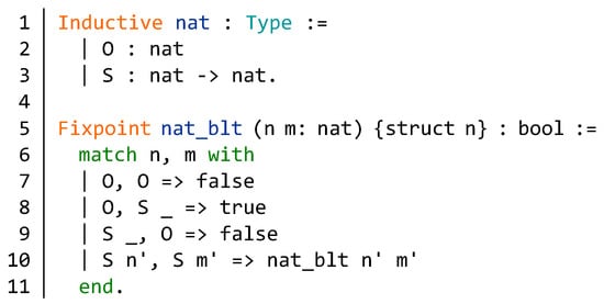 Using the command Inductive which can define a simple inductive type and its constructors, we inductively define nature numbers as data type nat (lines 1–3, Figure 2). The type nat has two constructors, O and S, respectively. The definition nat states that O is a nature number (nat) and if n is a nature number then S n is also a nature number. For example, the term S(S O), also written as number 2, is nat. According to the formal definition of nature numbers, we can construct a function in Figure 2 (lines 5–11). We construct the recursive function nat_blt to compare two nature numbers (n:nat) and (m:nat). If n is smaller than m, then the function outputs true. Conversely, the function outputs false. We implement it with the command Fixpoint which allows defining functions by pattern matching over inductive objects using a fixed point construction. The point of the {struct n} annotation is to tell the system which argument decreases along the recursive calls. In the function nat_blt, we first match the variable n and then match the variable m. The whole matching process is divided into four cases corresponding to different output results.