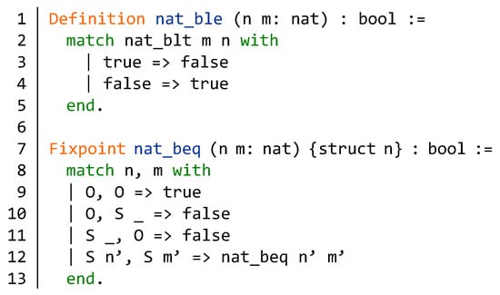 First we define a function nat_ble in Figure 3 (lines 1–5) according to the function nat_blt in Figure 2. Since the function nat_blt constructs the relation “<” on boolean, it is obvious that the function nat_ble defines the relation “≤” on boolean. As shown in Figure 3 (lines 7–13), on the basis of the definition of nat in Coq, we construct a conversion function that converts the equality relationship of natural numbers to boolean values. We use the recursive definition method in the same way that function nat_ble is defined. The function nat_beq can judge whether two natural numbers are equal. If two natural numbers are equal, the output is true. Otherwise, the output is false.