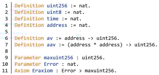Figure 4 declares some basic data types for defining safe computational functions of smart contracts. All integer types are modeled as nat in Coq formalization. The type uint256 is a 256-bit unsigned integer type. We normally define integer variables in contract as uint256 type. The uint8 type is used to define decimals. Both the time type and the address type are defined as nat. We define av in the line 6 and aav in the line 7 to represent the Solidity “mapping“ type in Coq. The type av represents the mapping (address ⇒uint256) and aav represents the mapping (address⇒ (address⇒ uint256)). The mapping about address and value occurs more frequently in most smart contracts. We can assign them to other types in the specific contract. maxuint256 is the maximum of the type uint256 and Error is the return value when an exception occurs. The command Parameter declares a global variable. In order to avoid interference with normal parameters of type uint256, we set the value of Error to be greater than maxuint256 in line 11.