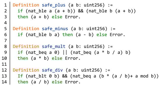 Next, as shown in Figure 5, we define safe arithmetic, which consists of some basic operators. These operators, which can prevent overflow, include addition, subtraction, multiplication, and division. The function safe_plus implements the safe addition of two uint256-type variables. By the judging condition in line 2, Figure 5, it ensures that the sum of two numbers must be greater than or equal to each addend. The function safe_minus implements the safe subtraction. Since the return value needs to be a positive number, the number b must be less than or equal to the number a (line 6, Figure 5). We define the safe multiplication in lines 8–10. According to the division and the function nat_beq, it can determine whether there is an overflow. The safe division is defined as the function safe_div. We ensure that the dividend is not zero and prevent overflow by the condition (line 13, Figure 5), where mode is a modulo function.