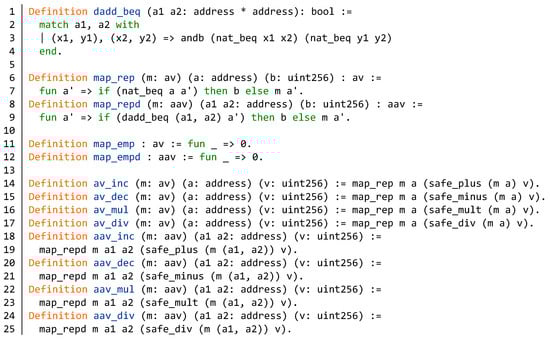 The functions defined above are all for variables of uint256 type. In smart contracts, we usually do arithmetic on mapping types. Therefore, we construct the safe arithmetic of mapping in Figure 6. In Figure 4 (lines 6–8), we define two mapping types av and aav that are common in smart contracts. Therefore, we build separate safe arithmetic functions for these two types. First, a function dadd_beq (lines 1–4, Figure 6) for judging two variables of type (address * address) is constructed according to the function nat_beq. It is to determine whether two variables are equal. Then we define two functions map_rep and map_repd in Figure 6 (lines 6–9). Based on these two functions, we can replace a value in the mapping or add a value to the mapping. Taking function map_rep as an example, we look for addresses equal to the address (a:address) in the domain of mapping (m:av) (line 7, Figure 6). The values of those addresses are assigned to the value (b:uint256). The -abstraction meets our requirements of the above development and it is implemented through function fun in Coq. As shown in lines 11–12, we define functions that map values to zero. Finally we define the safe arithmetic on the mapping in lines 14-25. av_inc and aav_inc are addition on mapping. av_dec and aav_dec are subtraction on mapping. The multiplication on mapping is defined as av_mul and aav_mul. The division on mapping is defined as av_div and aav_div.