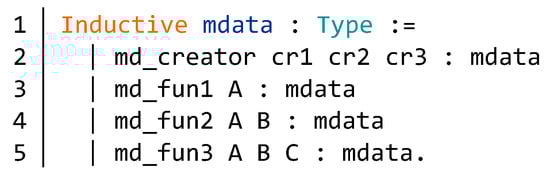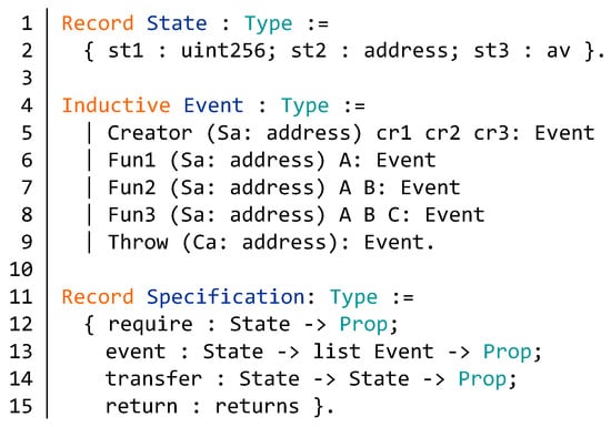 After defining the abstract model of contract status, the specific contract state can directly defined by the record type state in Figure 8. Moreover, as shown in Figure 10, we define a structural model mdata of the data in message calls. We can adjust it according to the specific contract. The message data of creator function is declared as md_creator in line 2 of Figure 10. The parameters cr1, cr2 and cr3 represent the initial parameters. The constructors md_fun1, md_fun2, and md_fun3 are message data for specific functions (lines 3–4, Figure 10). The number of input parameters for these events depends on the specific function. According to the specific function of the smart contract, then we construct an evaluation step that includes any of the possible invocations in the contract. When the environment is changed, we construct an evaluation step for the environment as well. Finally, the invariants are determined according to the specific requirements of the contract. We prove in the form of theorems that function calls and environmental changes do not change the invariants.