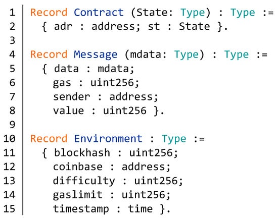 As shown in Figure 9, we present the abstract model of contract status, message calls, and current environment based on the Coq proof assistant. The type Contract (lines 1–2) records the status of the current contract, including the contract address adr and the state st of each variable in the contract. These variables may include the token name, total supply, owner address, token balance, and so on. Then we define the abstract message call model Message in lines 4–8. The parameter data is the complete call data, including call information for each function. We define the input parameter mdata based on functions in a specific contract. The parameter (gas:uint256) represents the current remaining gas in the contract. The “gas” is the name of a special unit used by Ethereum. It measures how much work action or a series of actions needs to perform. We can inquire about the address of the message sender through (sender:address). The (value:uint256) represents the amount of money attached to the message. Finally, in lines 10–15, we define the environment type Environment of the contract. The contract environment consists of some information about the current block, including block hash, miner’s address, difficulty, gas limit, and time stamp. In the specific contract, we can increase or decrease the parameters according to the actual situation.