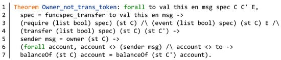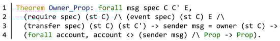As shown in Figure 11, we construct a formal verification method for the authority control issue. We verify the issue according to the mathematical theorem Owner_Prop. The input parameter msg is the message call of the function. The spec is the specification of the function. The parameters C and C’ are specific contract model. The E is the event list of the contract. In lines 2–3, we get the requirements, event, and state transition of the function spec. Furthermore, we specify that the message sender is the owner of the contract C in line 3. Then we can prove the specific property about the authority of the owner. The first Prop in line 4 is the property about the variable account. The second Prop is the specific property about authority control. The specific Prop of different contracts are different.