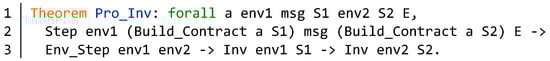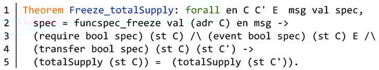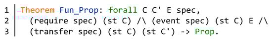 As shown in Figure 12, we define an abstract model Fun_Prop for verification of the function behavior. The input parameters C and C’ are different contract model. The E is the event list of the contract. The parameter spec represents a concrete function specification model. Line 2 defines the requirements of the function. The event and state transition of the function are obtained from lines 2–3. Then we can define the specific property of the function according to the above information. According to different functions, we can present different formal theorem descriptions.