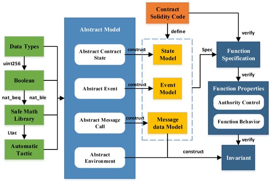 According to the formal verification methods for five types of security issues in the previous subsection, we present a formal verification framework for blockchain smart contracts in Figure 13. We construct the basic theory, as shown in the green box of Figure 13. The data types of smart contracts are the theory of the initial construction. We define the functions nat_beq and nat_ble which are conversion functions between natural numbers and Boolean according to the type (uint256:nat) in data types. Then a safe math library is constructed based on the functions. It can verify the integer overflow issue in smart contracts. In addition, we can use the Ltac strategy provided in Coq to enhance the automation of the proof. As shown in the light blue box, we next define the abstract model of the contract. The abstract model mainly includes the abstract contract state model, abstract event model, abstract message call model, and abstract environment model. These abstract models are built on the basis of the underlying theory. The orange box represents the Solidity code for a specific contract. According to the abstract models, we can define the state model, event model, and message data model of the contract in the yellow box. As shown in the dark blue box, the functional specification of the contract is defined according to the abstract structure Spec, which takes the above three models as input parameters. Then we verify whether the function in the contract conforms to the functional specification. If the contract function satisfies the specification, then we verify that it satisfies the properties of the function. The properties of functions are mainly divided into two parts: authority control and specific function behavior. Finally, we verify the invariant issue in the process of environmental change and message calls. The formal verification framework we developed can be used to verify the security of most blockchain smart contracts.