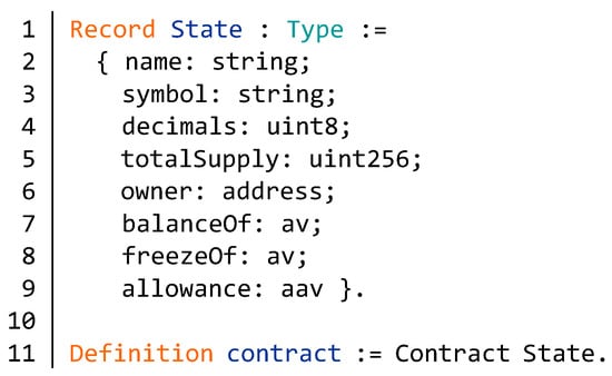 According to the abstract model of the formal verification framework proposed in the previous section, we define the specific model of the BNB contract. First, as shown in Figure 14, we formalize the specific state model of the BNB contract. The state variables of the BNB contract are the name, symbol, decimals, total supply, owner, the balance of address, freeze token of address, and allowance. Since name and symbol of the contract are a string type, we introduce the String library in coq and define name and symbol as type string (lines 2–3, Figure 14). The identifier decimals represents the number of decimal places in the token. The totalSupply is the total supply of the contract and the owner defines the address of the contract administrator. Both balanceOf and freezeOf are mappings of type av. The mapping balanceOf is the balance of an account address and the mapping freezeOf represents the frozen token of an account. The identifier allowance is a mapping of type aav and defines a quota for one address to another. The specific contract is defined in line 11 based on the stat model and the abstract model Contract.