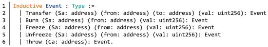 Then we define the specific event model of the BNB contract in Figure 15. There are four events in the Solidity code of the BNB contract. In line 2, the Transfer defines the transfer event, which generates a public event on the blockchain that will notify clients. The event Burn notifies clients about the amount burnt in line 3. The event Freeze and Unfreeze notify clients about the amount frozen and unfrozen in lines 4–5. In addition, we added an extra event Throw for the exception in line 6.