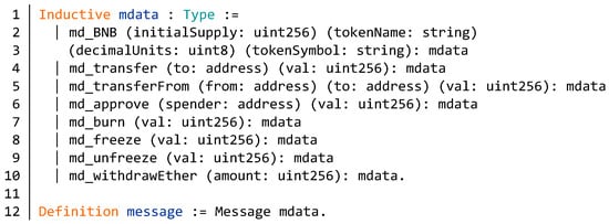 Finally, we define the specific message model of the BNB contract. As shown in Figure 16 (lines 1–10), we construct the message data mdata of the BNB contract. The constructors of mdata are consistent with functions of the contract. The md_BNB is the message data of the creator function. The input parameters of it are initial supply, token name, decimal units, and token symbol. The identifier md_transfer represents the transfer function which has two input parameters. The message data of the TransferFrom function is defined as md_transferFrom in the line 5. The input parameters of it are the from address, the to address and the value of transfer val. The input parameters of function md_approve are the spender address and the value of token. As shown in lines 7–10, the functions md_burn, md_freeze, md_unfreeze, and md_withdrawEther all have only one input parameter of type uint256. According to the definition of the message data, we define the specific message model in line 12. The identifier Message is the abstract message call model defined in Figure 9.
