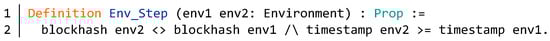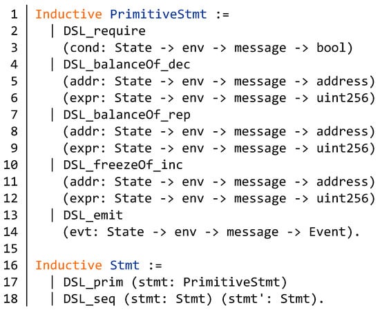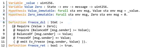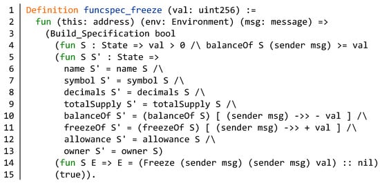 After completing the specification definition of the freeze function, we need to verify the Solidity code of the function. We convert the Solidity code in the BNB contract to Coq code through a domain specific language (DSL) which was developed by SECBIT []. DSL is able to complete correctness proofs of Ethereum token contracts. First, we define a Solidity implementation of the freeze function in DSL. Figure 18 describes the definition of DSL statements in the freeze function. In lines 1–14, the function PrimitiveStmt describes the behavior in the freeze function. In order to better display the code, we use env instead of Environment. The function Stmt construct a sequence consisting of constructors in PrimitiveStmt. Its structure is similar to the list structure.