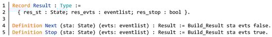 Then Figure 19 (lines 1–2) define a record type Result which is the result of each behavior in freeze function. The identifier res_st is the state at the end of the behavior. The res_evts records the list of event. The identifier res_stop determines whether the function stops. There are two definitions of the type Result in lines 4–5.
