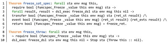 Finally, as shown in Figure 21, we verify the specification of freeze function according to the proof of two mathematical theorems. The first theorem freeze_sat_spec (liens 1–6) is to prove that the property, event, and the return value of the function satisfy the specification when the requirements of function specification are satisfied.