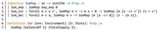 According to our analysis, there is no fixed invariant in the BNB contract because of the presence of the burn function. Nevertheless, we can verify that the sum of the account balances in the BNB contract is always equal to the total supply. As shown in Figure 23, we formalize the above proposition. We define a function SumMap that can sum the mapping in lines 1–4. The function has two input parameters, one is the mapping, and the other is the sum of the mappings. The function can be divided into three cases. If the mapping is map_emp, the sum of the mapping is 0. The constructor Sum_inc can add a value v’ to the map. The Sum_dec can remove an address m from the map. Therefore, the function Inv is defined in lines 6–7, that is, the sum of the account balances in the BNB contract is the total supply of the account. Then we prove that this property will not change under any circumstances.