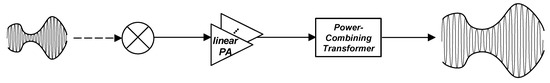 Power-combining techniques are widely used in the design of power amplifiers (PAs) to sum the power from individual linear PAs. Figure 1 shows a block diagram of a radio frequency (RF) transmitter, including a PA with a power-combining transformer. For on-chip power-combining techniques, many studies have used power-combining transformers, such as series-combining transformers (SCTs) and parallel-combining transformers (PCTs) [1,2,3,4,5].