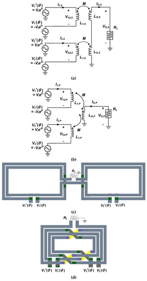 The input voltages of the outphasing combiner are and , where is the outphasing angle. For the differential case, the input voltages of the combiner are , , , and . As shown in Figure 3a, the voltage differences between the positive and negative parts of the primary winding are: