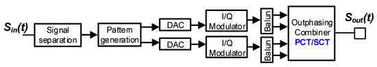 The amplitude and phase modulated input signal is decomposed into two constant-amplitude phase modulated signals, and . Thus, switching PAs can be used to amplify and , as shown in Figure 2. The two amplified signals from the two switching PAs are summed through an outphasing combiner to reconstruct the original signal with increased amplitude. To reconstruct the desired signal properly through the outphasing combiner, the condition of Equation (3) must be met for the amplitude of the combined signal. Thus, the summation property can be achieved when the amplitude through the output combiner is proportional to [14,15].