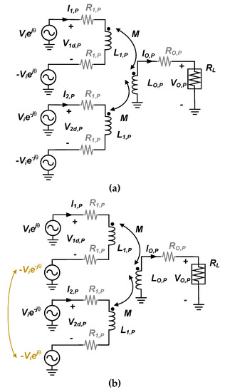 To consider the power loss of the transformer, the loss resistors and are added in Figure 7a. The power loss in each primary winding can be expressed as . The current flowing through the primary winding can be expressed as: