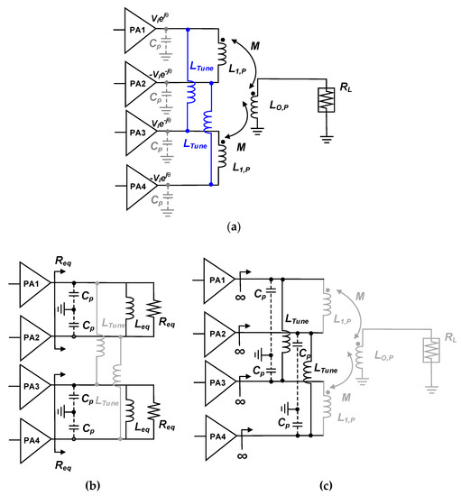 For the out-of-phase mode, the equivalent circuit is shown in Figure 8c. The voltage potentials are the same for two transformer inputs of the PCT (the outputs of PA1 and PA2 or the outputs of PA3 and PA4). Therefore, no current flows through the input primary winding of the PCT. The efficiency at the back-off level is decreased by the effect of parasitic capacitors. Thus, to improve efficiency at the back-off level, a class-D PA with a power-combining transformer for the outphasing system is proposed. In the proposed architecture, additional tuning inductors, , are added to remove the effect of the parasitic capacitance in the out-of-phase mode. These parallel resonant circuits provide very high impedances, resulting in the reduced contribution of the out-of-phase components. In addition, the voltage potentials are the same for the outputs of PA1 and PA3 (or the outputs of PA2 and PA4) in the in-phase mode, so no current flows through the tuning inductors. Thus, the operation of the in-phase mode is not affected by .