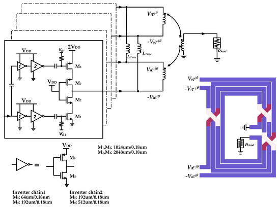 The proposed outphasing system is designed with four class-D PAs using the proposed PCT. Figure 9 also shows a simplified schematic of the class-D PA and its associated circuits, including the inverter chain. The four outphasing PAs are connected to positive or negative parts of the two primary windings of the PCT. A cascoded inverter-based class-D PA using thin-gate devices is designed using a 3.6 V supply. Thin-gate devices of L = 0.18 μm are used to minimize on-resistance as well as parasitic capacitances of the transistor. To increase output power from each unit class-D PA, the cascoded inverter topology is adopted, which allows an output voltage swing of twice the nominal supply voltage (VDD = 1.8 V). The transistor widths of NMOS (M1/M2) and PMOS (M3/M4) on each unit class-D PA are 1024 μm and 2048 μm, respectively, as shown in Figure 9. Each inverter chain operates with a 1.8 V supply.