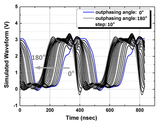 The two tuning inductors shown in Figure 9 are added between the drains of two class-D PAs to improve the back-off efficiency. The EM simulated tuning inductance, , is 2.15 nH at 1.7 GHz. Figure 10 shows the simulated efficiency versus output power with and without tuning inductors. An EM simulated transformer model is used for the circuit simulations. The results show that the proposed PA, with tuning inductors, improves the efficiency performance by approximately 10% at the 6-dB back-off level (55-mW output power) of the output power. Figure 11 shows the simulated output voltage waveforms of each class-D PA. The simulated voltage waveforms of the class-D PAs are not degraded with the variation of the outphasing angle because of the tuning inductor method. Thus, the efficiency performance can be higher when the outphasing angle is increased, as shown in Figure 10.