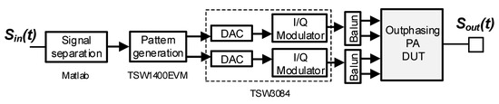 The signal decomposition into and was performed using MATLAB, as shown in Figure 13. The decomposed data were downloaded into a pattern generator and fed to a dual-RF channel TSW3084 board with digital-to-analog converters (DAC3484) [20,21]. To generate the differential signals, external baluns (BALH-0006) were used. Thus, two differential RF signals (, were applied to the test chip. The offset of the path mismatch between the paths for and was measured with a signal analyzer, and corrections for the offsets were applied to the pattern generator.